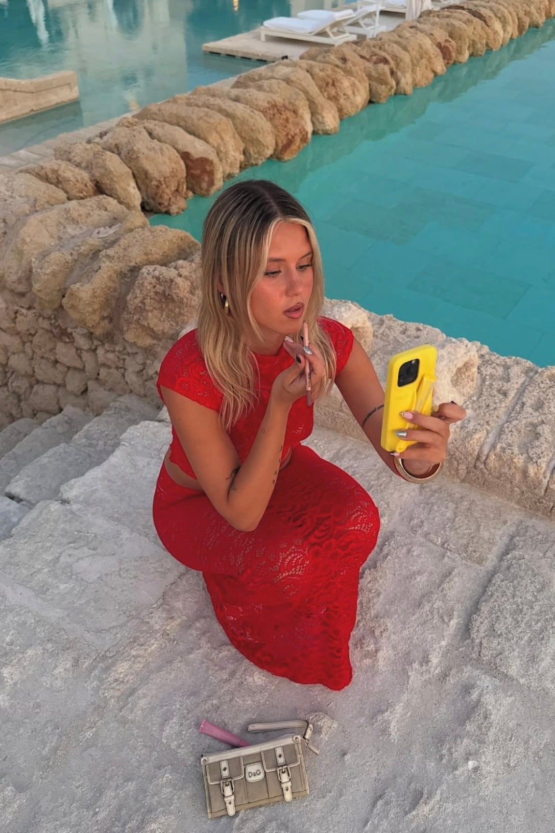 Make a statement in the Marisol Lace Set, crafted from luxurious floral lace in a bold red hue. The form-fitting top features a high neckline, scalloped hem, and delicate sleeve edges, while the matching skirt flatters with its contoured fit and romantic lace trim.