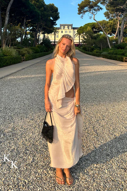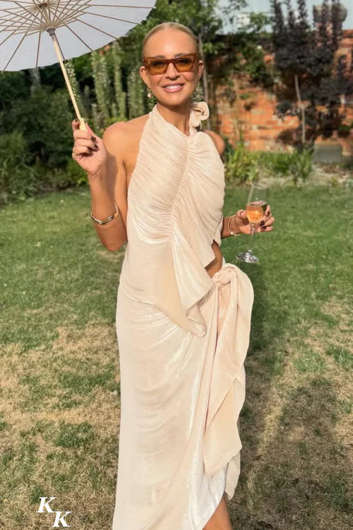 Meet the Bobbie Set by Koster Kulture — a luminous two-piece designed for elevated evenings and moments that linger. The halter top features meticulous hand-tacked draping that cascades in sculptural waves across the torso, while open back detailing and an adjustable neck tie ensure a custom, flattering fit. Paired with a floor-length sarong-style wrap skirt that cinches elegantly at the waist and opens to a soft side slit, every movement is met with liquid shine. Crafted from the same glossy, flowing champagne fabric throughout, the set catches light with a subtle sparkle that radiates understated luxury from every angle. A true showpiece for destination glamour and timeless charm.