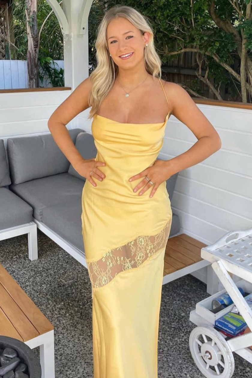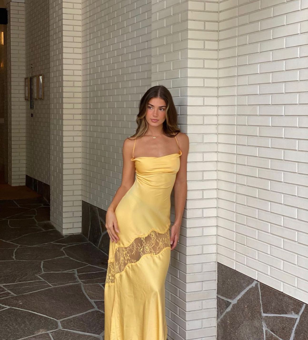 Featuring a cowl neckline and extreme low back come together in a classic slip silhouette - adorned with delicate lace to exude a romantic state of mind. She features skinny halter straps that cross-over on the back and a side split for a sleek and streamlined appeal.